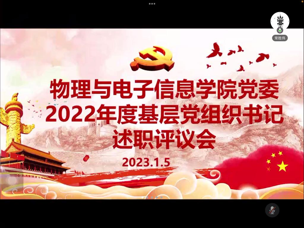 为深入贯彻党的二十大精神,强化基层党组织书记管党治党意识、落实管党治党责任,按照校党委抓基层党建工作述职评议考核的有关部署和要求,1月5日下午,物电学院党委在腾讯会议线上召开2022年度基层党组织书记抓党建工作述职评议会议。院领导班子成员、院党委委员、教工第一、第二党支部委员,研究生、本科生党支部委员,教工和学生党员代表共30余人参加会议。评议会由院党委书记常胜伟主持。