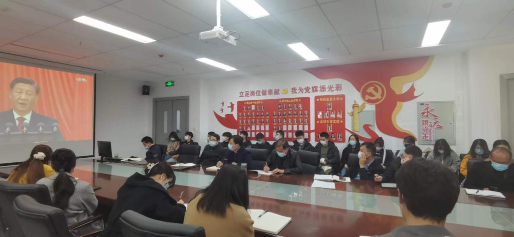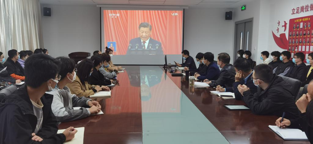 习近平总书记代表第十九届中央委员会向大会作了题为《高举中国特色社会主义伟大旗帜为全面建设社会主义现代化国家而团结奋斗》的报告。系统回顾与总结了过去五年的工作和新时代十年的伟大变革,科学展望、描绘了新时代新征程中国共产党以中国式现代化全面推进中华民族伟大复兴的使命任务。在直播观看现场,全体同志共同高唱中华人民共和国国歌,聚精会神听报告,全神贯注做笔记。