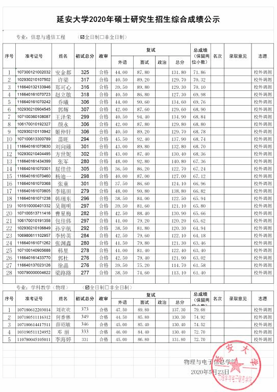 根据《教育部办公厅关于做好2020年全国硕士研究生复试工作的通知》(教学厅〔2020〕4号)文件和陕西省教育考试院有关文件和会议精神、公海贵宾会官网jcjc5500《关于做好2020年硕士研究生复试录取工作的通知》相关规定,我院根据第一批复试情况,于5月22日组织第二批(校外调剂)复试,现就复试后综合成绩予以公示,公示期为 2020年5月23日上午11:00至2020年5月24日上午11:00,如有考生对成绩有疑问,可在公示期间以电话、电子邮件形式反馈,逾期不予受理。