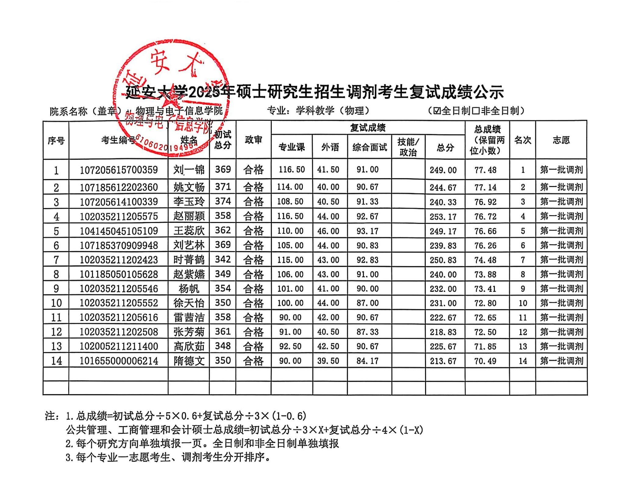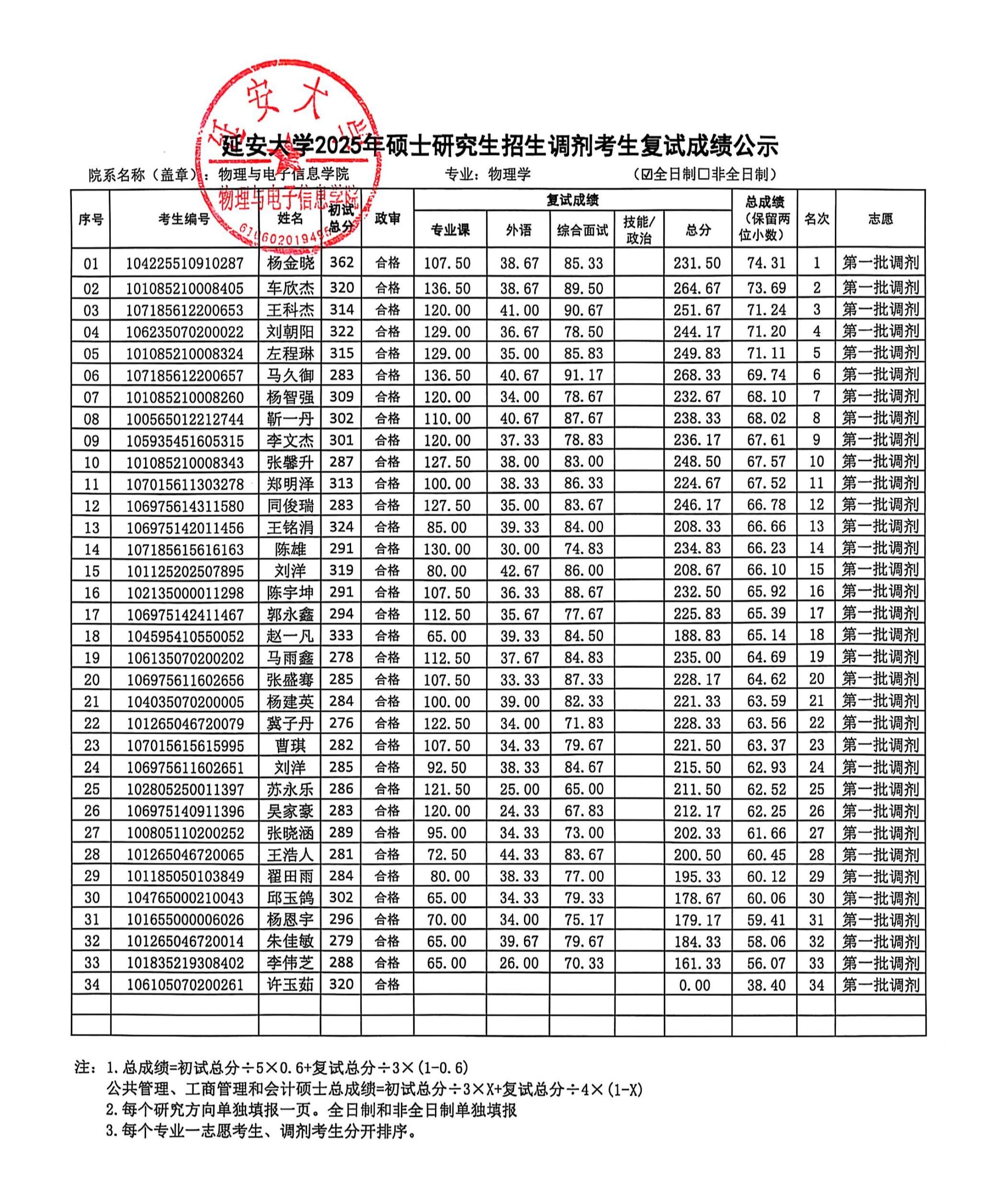 依照我院2025年硕士研究生复试工作实施方案,安排在2025年4月8日的学科教学(物理)和物理学专业调剂考生复试工作已经圆满结束。复试成绩上报研究生院审核后,现将具体的复试成绩进行公示,公示时间为十个工作日,如有异议,请按照以下联系方式进行咨询。