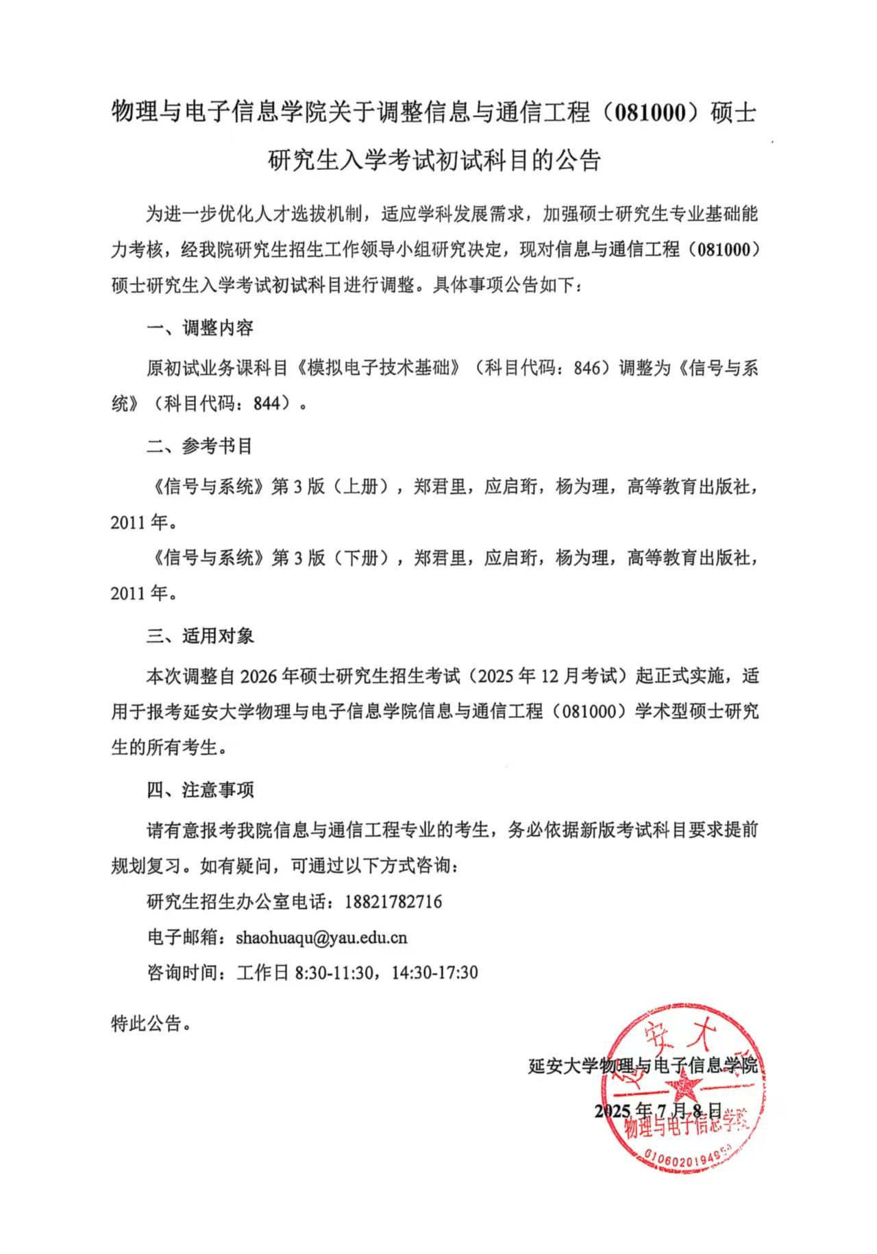关于调整“信息与通信工程”研究生入学考试初试科目的公告
