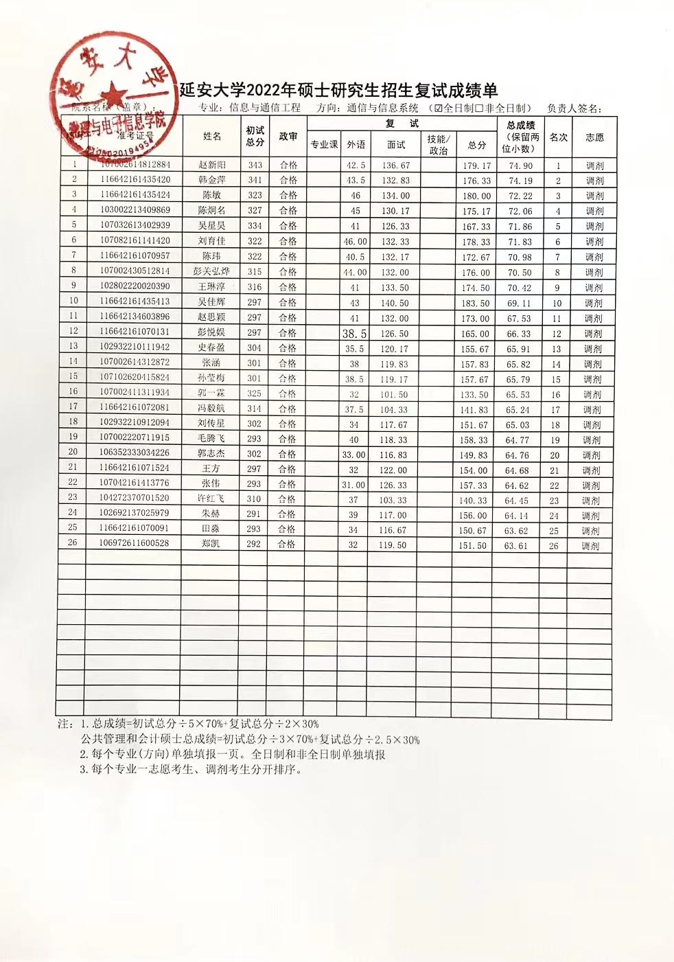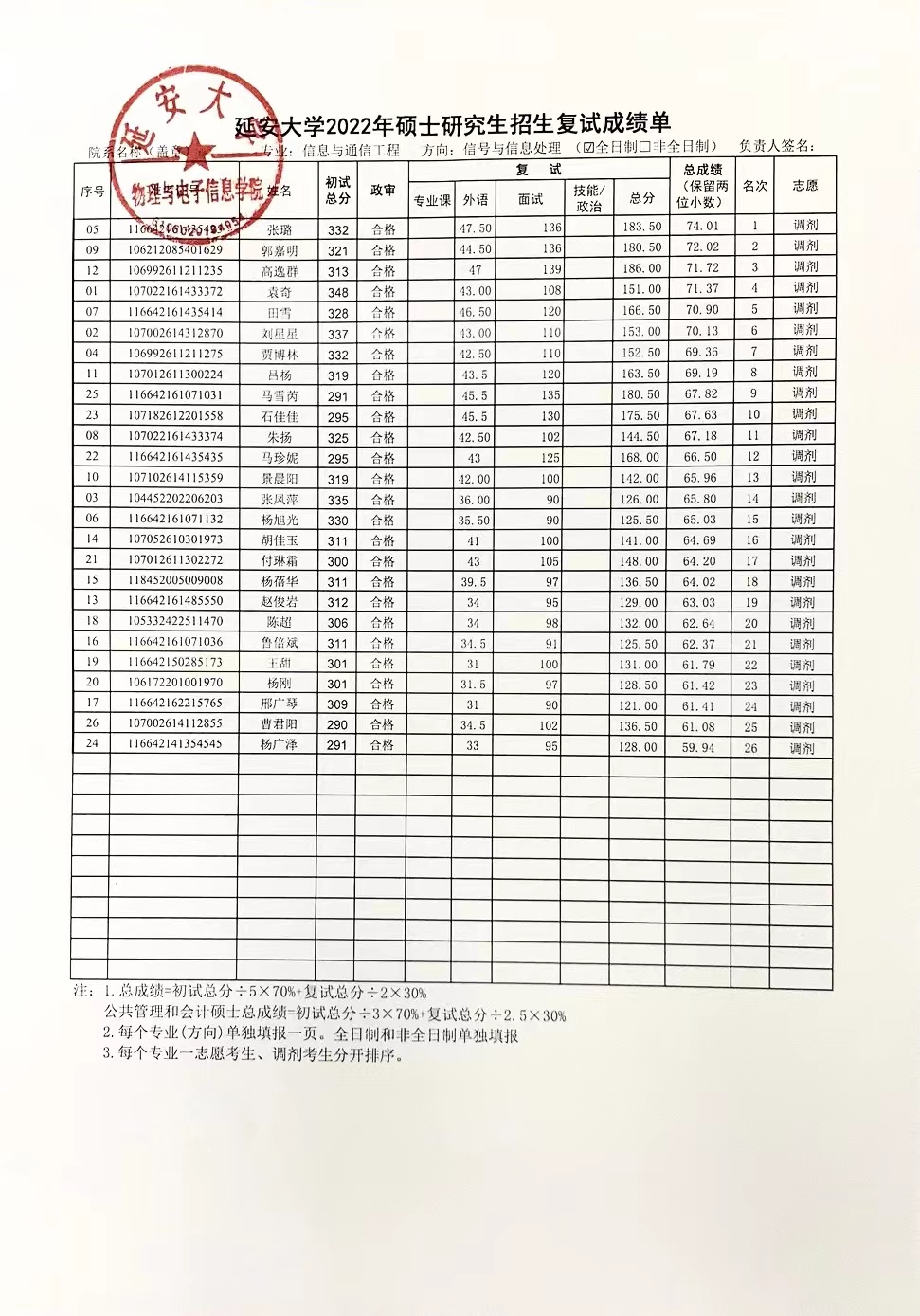 依照我院研究生调剂复试工作的计划,安排在2022年4月14日的信息与通信工程专业复试工作已经圆满结束,现将具体的复试成绩进行公示,请各位考生查收。