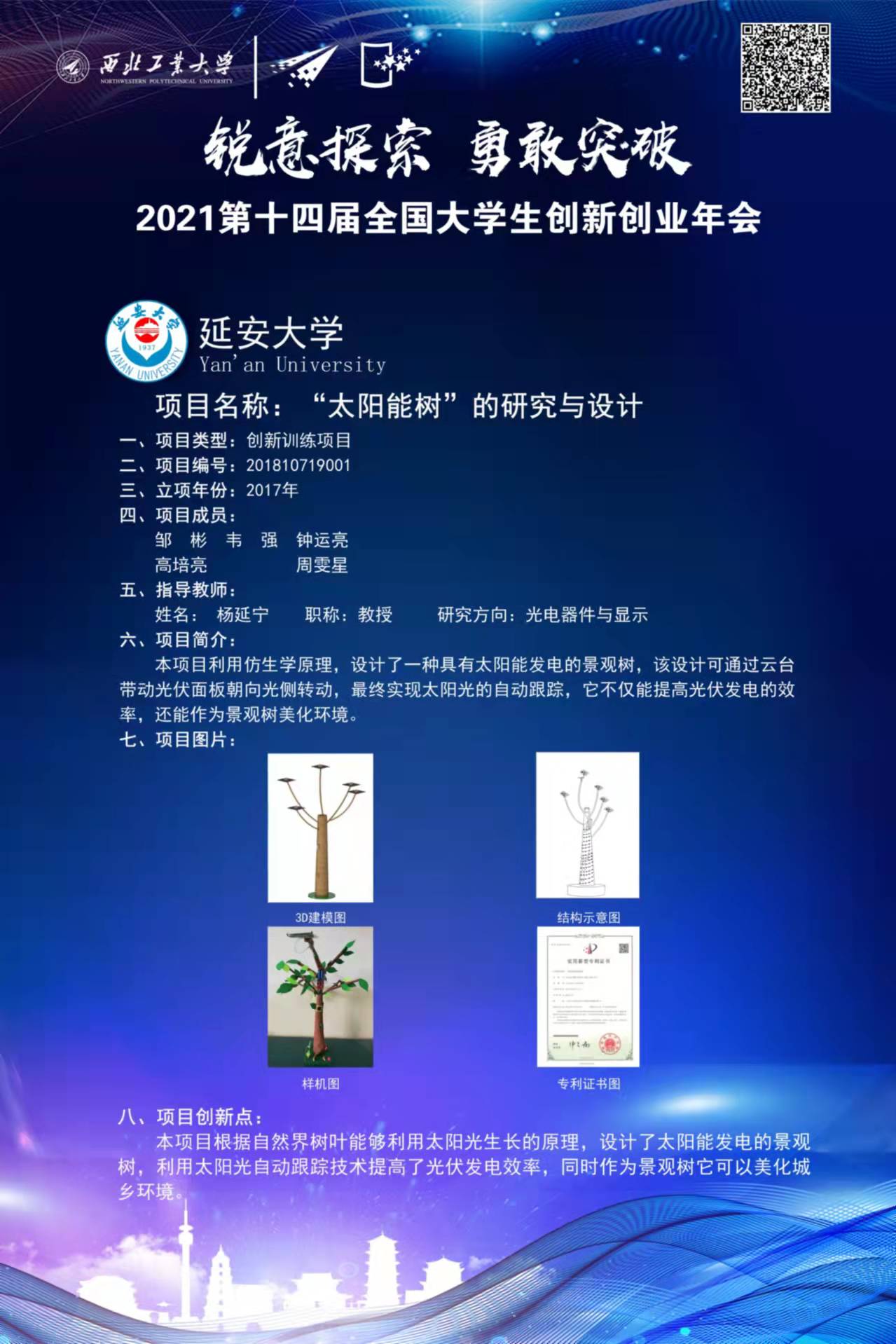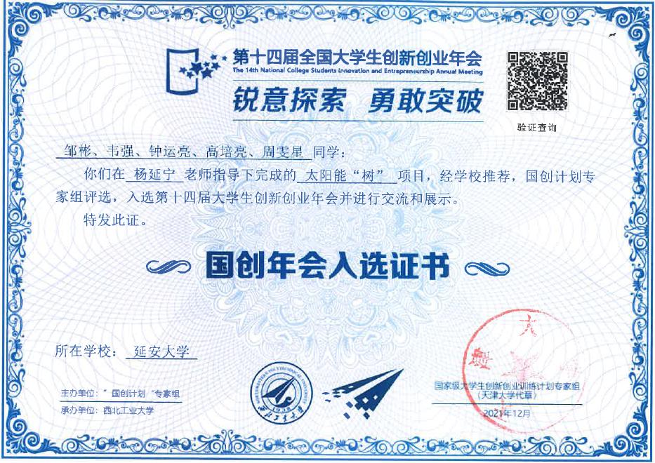 我院杨延宁教授指导、学生邹彬主持完成的“太阳能树”的研究与设计国创项目成功入选,是我校唯一入选的大创项目,该项目于2017年立项,项目利用仿生学原理,设计了一种具有太阳能发电的景观树,该设计可通过云平台带动光伏铭板朝向光侧转动,最终实现太阳光的自动跟踪,不仅能提高光伏发电的效率,还能作为景观树。通过参加本次全国大学生创新创业年会,提高了我校的知名度,同时进一步深化高校创新创业教育改革,加强我校与其他学校的交流与沟通,为学生搭建创新创业交流展示平台,展示高校创新创业教育方面的成果,促进高校创新创业教育和文化建设。该项目的入选,是我院大学生创新创业工作的一个突破。